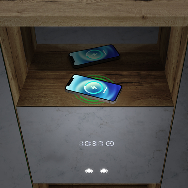 Bekijk de extra voorzieningen: de inductieve oplader laadt uw smartphone efficiënt op, en het stopcontact is een handige plek om een föhn aan te sluiten.