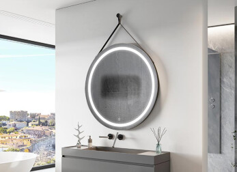 De ronde verlichte spiegel hangt aan een leren riem, die verkrijgbaar is in drie kleurenvarianten: zwart, lichtbruin en donkerbruin. Dankzij deze opties kun je de spiegel afstemmen op je smaak en de stijl van je interieur. Stijlvolle riem van authentiek leer.