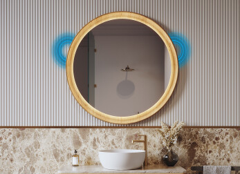 Afgeronde spiegel in een eikenhouten lijst met LED-verlichting
